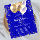A royal blue background. Decorated with faux gold glitter, sparkles and balloons. Personalise and add a name and party details. The name is written with a hand lettered style script.
