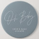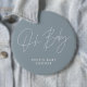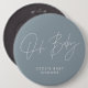 Baby shower script modern minimal dusty blue 6 cm round badge