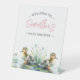 This baby shower welcome sign features a bottom boarder of watercolor woodland ducklings. The mother to be name is set in trendy script typography in dusty pink. Use the template fields to customise the text. Perfect for a baby girl shower. To see the matching spring and summer suite visit www.zazzle.com/dotellabelle