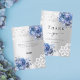 A modern and elegant baby shower thank you card. A faux silver looking background. Decorated with blue roses, florals flowers and lace. On the front the text: