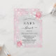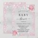A modern, elegant baby shower, celebrating a baby girl. Faux silver metallic looking background decorated with pink faux glitter, sparkles and flowers. Personalise and add a name and party details. Black coloured letters.