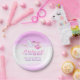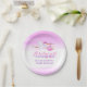 Cute baby shower stork delivering a baby girl paper party plates. Ideal for a special pink baby girl showering party or event. Personalise with your mother to be name and wording. Currently reads A baby girl is on her way dig in and honour mother-to-be Danielle MacDonald. Original watercolor whimsical art and design by Sarah Trett for www.mylittleeden.com