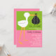A baby shower invitation featuring an illustration of a stork carrying a black bundle with white polka dots. Background is green on top half and pink on bottom half. Personalise the text with details of your occasion.