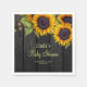 Rustic floral chic yellow gold sunflower baby shower personalised paper napkins with elegant script on a brown barn wood background with string lights.