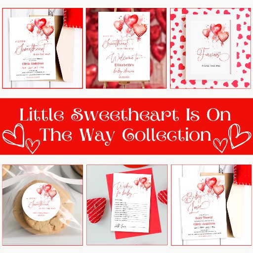 This enchanting design captures the essence of joy and love, featuring whimsical watercolor elements that evoke a sense of tenderness and anticipation. The modern aesthetic seamlessly blends with adorable red watercolor balloons shaped like hearts. Each stroke of watercolor adds a touch of artistic charm, creating a visual symphony that celebrates the sweetness of new beginnings. The Valentine theme infuses the invitation with a timeless charm, perfect for showering the little one with love. Matching items available.