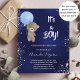 For a baby shower celebrating a baby boy. A navy blue background, the blue colour is uneven. Decorated with faux silver glitter dust. A teddy bear holding a light blue balloon. Personalise and add the name of the mum to-be and party details. The name and the text: It's a Boy! are written with a hand lettered style script