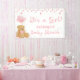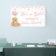 Cute personalised baby girl shower welcome banner sign featuring the title IT'S A GIRL and a watercolor brown teddy bear with a pink bow and pink heart balloon bouquet with a pink glitter stars garland border. HELP: For assistance with design modification/personalisation, transferring the design to another product or would like coordinating items for your baby shower experience, contact the designer BEFORE ORDERING via Zazzle Chat or makeitaboutyoustore@gmail.com.