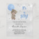 For a baby shower celebrating a baby boy. A faux silver metallic looking background. A teddy bear holding a blue balloon stars and faux glitter dust. Personalise and add the name of the mum to-be and party details. The name and the text: It's a Boy! are written with a hand lettered style script