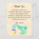 Adorable personalised baby shower thank you card. Baby yellow background, a baby elephant showering a baby duck. Thank you sentiment that reads: "Thank you for coming to my baby shower and helping celebrate the upcoming arrival of our new baby. Thank you for the wonderful gift. Your kindness and generosity are greatly appreciated. We look forward to introducing our little one soon." All our products can be custom designed to meet your needs at no extra charge. Simply contact us through our store. Coordinating products available: Just ask us!