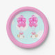 Creative baby shower plates featuring sweet twin girls and pink balloons.