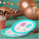 Cute twins baby shower plates featuring twin girl and boy beneath bouquets of pink and blue balloons.
