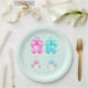 Sweet twins baby shower plates featuring girl and boy twin babies in helmets and blue and pink balloons.