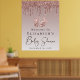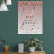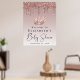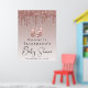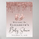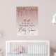 Glam personalized welcome poster for your baby shower featuring rose gold faux glitter dripping down an ombre rose gold background, an illustration of baby feet in rose gold glitter and "Baby Shower" in a stylish script. Personalize with your name and shower date.