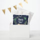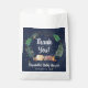 Cute baby shower party favour bags featuring an illustration of woodland animals with their tent camping in the mountains and forest under a starry midnight blue sky and "Thank You!" and the mother-to-be's name in a white script.