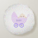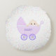 Cute violet baby stroller with baby and multicolored stars on white background Pillow. Baby text can be personalised.