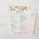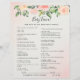 This baby shower game card features beautiful soft pastel watercolor roses and peonies in shades of blush pink and peach with lush green botanical leaves and eucalyptus.