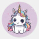 Wow your birthday guests with this stylised, cartoon-like unicorn with a multicolored mane and tail, a golden horn, and a sweet, friendly face with large, sparkling eyes. Set against a pastel purple background adorned with small, whimsical sparkles and snowflakes, this sticker would likely be a hit with children, especially for occasions such as birthday parties, or for anyone who enjoys cute, magical, and mythical-themed artwork. It's a perfect addition to a collection of whimsical or fantasy-themed stickers.