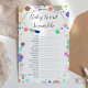 This baby shower game card features a script modern font on multicolor dots background, perfect for a baby boy, baby girl or a surprise! Use this card for your gender reveal party! Back Side with the answers!