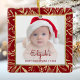 Celebrate baby's first Christmas with this beautiful keepsake ornament. Easily replace the sample image with your own favourite photo and customise it with baby's name in burgundy red script font and the year below. A white gradient screen helps make the text pop. The photo is set off by an elegant square frame decorated with hand-drawn gold faux foil foliage on a burgundy red background.