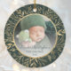 Celebrate baby's first Christmas with this beautiful keepsake ornament. Easily replace the sample image with your own favourite photo and customise it with baby's name in dark green script font and the year below. A white gradient screen helps make the text pop. The photo is set off by an elegant round frame decorated with hand-drawn gold faux foil foliage on a dark green background.