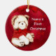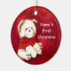 A cute teddy bear on a Christmas ornament. The ornament has the customisable text "Name's First Christmas" and templates for your personalisation.