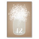 A wedding table number place card featuring a mason jar of baby's breath illustration over a card stock inspired background.