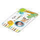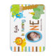 Upload your own photo and customise the text on this adorable Baby's First Birthday photo magnet. Brown, blue, yellow orange and green stripes are the background accent to this whimsical animal themed design. There is a monkey hanging from a tree, a lion and an elephant all wearing colourful polka dot birthday hats. Text reads: BABYNAME is turning ONE". The "O" in one serves as the frame for your own baby's photo. You can add the birthday to this design with the remaining available customisable text or if you prefer, delete the text completely.