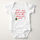 Baby's First Christmas design features the phrase, "Wait...you mean we get to do this again next year?" in red, decorative lettering surrounded by Christmas stockings and the image of a Christmas tree just below it.