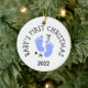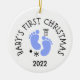 A beautiful ceramic tree decoration featuring a baby's feet in blue is the perfect holiday keepsake for new parents and family members. Customise the date