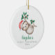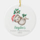 Baby's First Christmas Custom Name Sloth Ceramic Ornament — The precious personalised newborn's xmas ornament template features an adorable watercolor holiday sloth, hanging from a holly branch and wearing a santa hat. The text boxes allow for easy customisation of a baby's name in a handwritten bold muted green calligraphy script font, and birth year in a simple, minimalist sans serif in slate grey. Both sides of this personalizable keepsake tree decoration are identical.