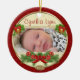 A beautiful personalised Baby's First Christmas "your photo" holiday art keepsake ornament! This lovely double sided ceramic ornament is a wonderful way to preserve your baby's first Christmas holiday memories and display them year after year as holiday heirloom decor. This design features lovely green garland with red and gold ornaments and a poinsettia flower on the bottom and a red and gold trim digital art bow on top. Lovely golden trips and frame around the image area, and year plaque on the bottom. The rim of the ornament is red snowflake pattern. Simply upload your photo to the front to replace the sample image in the centre. (Please Note: The higher the quality of your uploaded photo, the better it will display/print on the plate) Personalise the ornament on top with your baby's name and add the year on the bottom for a finishing touch! To edit the font style, size or colour, simply click on "customise" under the photo image on this page and those options will also be made available to you! This is a wonderful family keepsake to add to your collection, or as a meaningful gift for a friend, or family member will treasure! For more personalised holiday ornaments, home decor, and keepsakes please visit our shop!