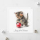 Capture the magic of the season with this darling watercolor card featuring a fluffy tabby kitten playfully batting at a bright red Christmas ornament. The artwork features delicate paint splatters and soft, feathery fur textures that create a whimsical and artistic feel against the clean white background. This customisable design is the perfect keepsake for a child’s first holiday, a new pet announcement, or any cat enthusiast who loves a touch of feline charm.