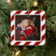 Baby's First Christmas Keepsake Ornament | Baby's photo is framed with a festive candy cane stipe design. The back of the ornament has (Baby's Name)'s 1st Christmas along with the year. The typography is an old English style type with each letter decorated with vintage Santa's for a festive look. Baby's first Christmas should be a memorable occasion--commemorate it with this personalised keepsake ornament. Makes a great gift for new parents or grandparents.