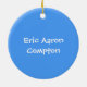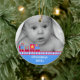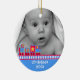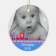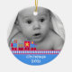 Sweet baby's first Christmas ornament made out of a round shaped ceramic with a pretty gold cord. Graphics of a colourful toy train bordering a blue background, at the bottom of the ornament, and a custom photograph, at the top of the ornament. White text on the bottom blue area and on the backside is fully customisable. Personalise all the text and the photo of your baby, for a sweet first Christmas or as a lovely gift for the new parents or grandparents.