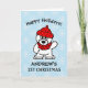 Baby's first Christmas personalised cute polar bear winter Holiday greeting card. Custom xmas card design with winter teddy bear on ice skates and snowflakes. Funny animal illustration for new baby boy or girl. Personalizable card with kids name and Happy Holidays greeting. Unique cards for newborn child or soon to be mummy. Make your own first xmas party cards for son, daughter, grandson, granddaughter, grandchild, nephew, niece etc. Merry Christmas!