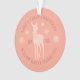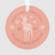 Modern baby dusty blush pink ornament for baby's first Christmas personalise with baby's name, year, deer with a bow, snowflakes and curve lettering in serif font.