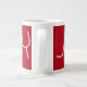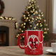 This festive Baby Boy's First Christmas Photo mug is decorated with the word JOY on a maroon-red background. Easily customizable with your photo, name, and year.
