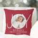 This festive Baby's First Christmas Photo pillow is decorated with the word JOY on a maroon red background.