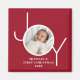 This stylish Baby's First Christmas Photo Magnet features the word "JOY" on a red maroon background.
