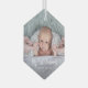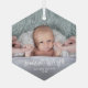 Celebrate the simple joys of your newest family member with a custom photo "My First Christmas" hexagon-shaped glass ornament. Gender neutral design is suitable for a new baby boy or girl. Picture and all wording on this template are simple to personalize. The modern minimalist black and white overlay design features one image of your choice and a stylish handwritten script typography message, name and year. This unique family keepsake adds an elegant touch to Xmas home decorations.