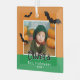 Baby's First Halloween Black Bats Photo Glass Ornament. A custom baby's name in a trendy script and 3 black bats. The colours are autumn colours - green and orange. Personalise the ornament with your baby's photo, name and year. A lovely Halloween holiday keepsake.