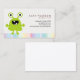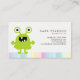 This is a babysitter business card with a cute funny green monster alien on the left side of the card. There's a pastel striped border on the bottom of the card, with your name, title and basic contact details on the right side of the card.
