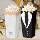 Black suit and tie bachelor party popcorn favour box. Personalise it with the groom's name.