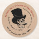 Unique bachelor party invitation done on a paper coaster with a cardboard looking background and graphics of a skeleton skull, wearing a top hat and smoking a cigar. Personalise all the text fields to suit your event needs.