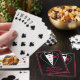 Fun playing cards with a black tie tuxedo and red rose flower corsage to personalise with the groom's name for a bachelor party poker game. Personalised playing cards also make a fun wedding usher gift.
