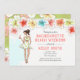 Bachelorette Beach Weekend Getaway Invitation features a tropical theme with hibiscus flowers and brunette bride to be enjoying a cocktail. Available with blonde, brown, red hair girl and with dark or light skin. Back of invitation features cocktail and details.