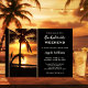 Beach bachelorette weekend itinerary template featuring a sunset at a tropical beach with palm trees. You can choose your own background color to replace the black if you like. On the back is an easy customizable QR code template. You can also just delete it if you do not need it. Beautiful for a tropical weekend getaway.