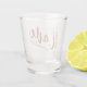 Calligraphy script "drunk in love" quote bachelorette party shot glass favour with the bride's name and party date in a rust reddish rose gold copper colour.
