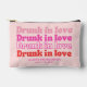 Bachelorette Party Favour Personalised Pink Accessory Pouch. This trendy design features the phrase "Drunk in Love" in a stylish retro font, with plenty of room for customisation with the bride's name and the date or location along with a custom name on the back. Perfect favour for your event to add some fun and flair.