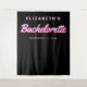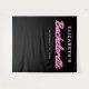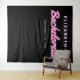 Cool bachelorette party photo booth tapestry with "Bachelorette" written in a hot pink script with a neon lights effect against a black background. You can customise with her name and party date. A blank area at the bottom provides space for guests to take photos against the backdrop.